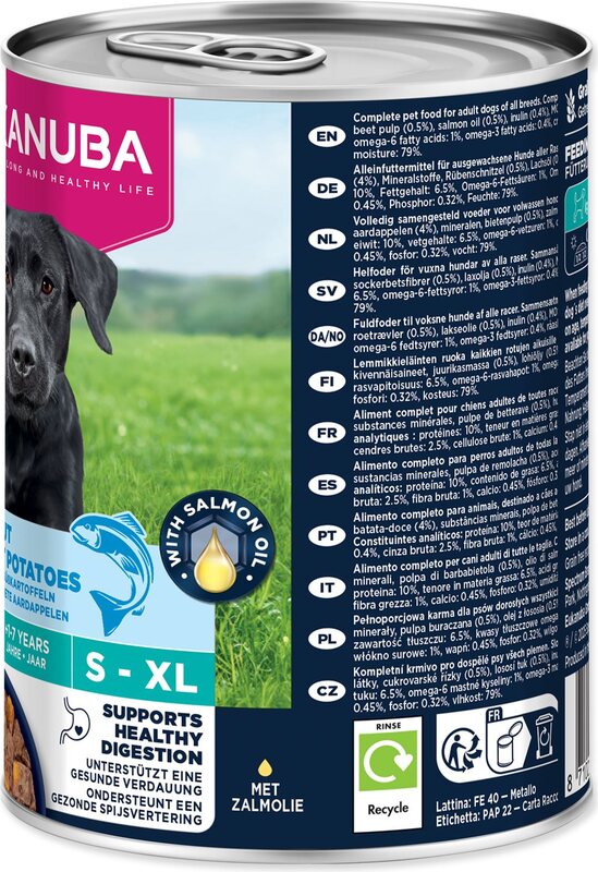 - Bataty pre rozmanitosť, lososový olej s omega-3, repková dužina, inulín a prebiotiká pre trávenie.