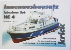 Sada maketových dielov vnútornej vstavby trupu modelu lode Krick Policajný čln HE 4. Sada obsahuje laserom vypálené plastové a preglejkové vďaka, maketové doplnky a lanové.