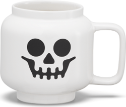 Keramický hrnček má podobu hlavy klasickej minifigúrky s potlačou kostry.