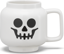 Keramický hrnček má podobu hlavy klasickej minifigúrky s potlačou kostry.