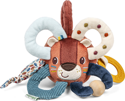 Farebná látková senzorická loptička v podobe plyšového leva Jacka je vhodná pre deti od narodenia. Vďaka svojmu okrúhlemu tvaru a veľkému množstvu držadiel, je táto hračka ľahko uchopiteľná, zabaví vaše dieťatko a zároveň mu pomôže stimulovať zmysly a jemnú motoriku. Loptička má rôzne potlače a materiály, štítky, stuhy, drevenú guľôčku a tiež silikónový krúžok, ktorý je ideálny na úľavu pri prerezávaní zúbkov. Možno prať na ručné pranie.