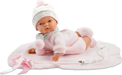 Llorens Joelle Llorona Toquilla Rosa 38938Hovoriaca bábika s mäkkým látkovým telom. Po vytiahnutí cumlíka z úst začne bábika hovoriť „mama“, „papa“ a vydávať reálny zvuk plačúceho bábätka. Bábiku možno utíšiť cumlíkom.