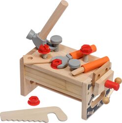 - Obsahuje sortiment detského náradia, ako je kladivo, pílka, skrutky, skrutkovač, kľúč, zverák a niekoľko kusov hladkého dreva s otvormi.