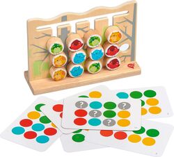 - Hračka má drevenú dosku so štrbinami, kolíky na ktorých sú farebné zvieratká.
