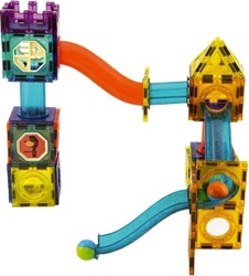 Zostavte magnetickú guličkovú dráhu podľa návodu alebo podľa vlastnej fantázie a zábava môže začať. Polepte samolepkami diely na to určené, hárok so samolepkami je súčasťou balenia.