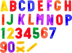 Súprava obsahuje plastové písmená a čísla s magnetom, ktoré by mali byť pripevnené k magnetickej tabuli.