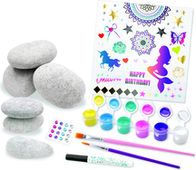Kreatívna súprava ponúka deťom zdobenie kameňov, ktoré sú v tejto sade pripravené s rôznorodými motívmi.