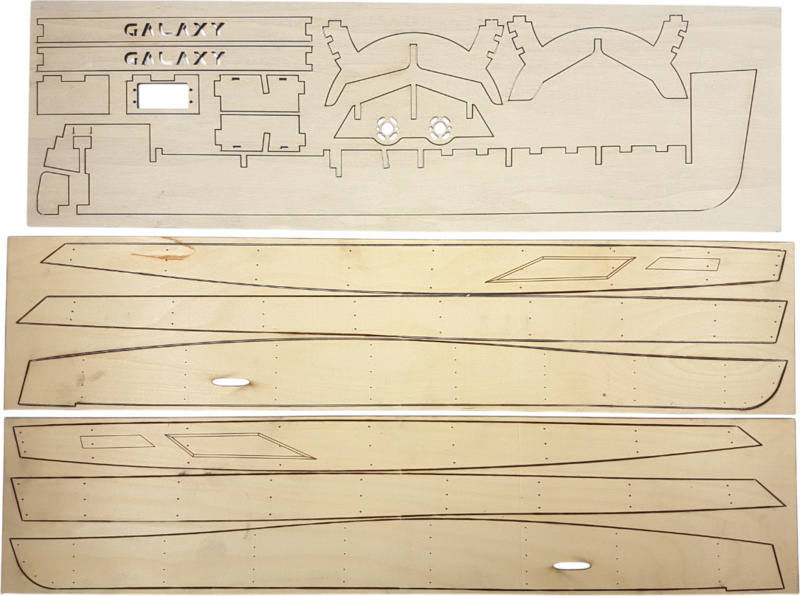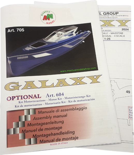 Stavebnica modelu lode Mantua Model Galaxy 53ft luxusná jachta 1:25. Obsahuje diely na stavbu modelu ako napríklad - laserom rezaná preglejka a ďalšie diely na detailné spracovanie, hriadele a dva lodné skrutky. Môže byť zostavená ako neplávajúca maketa aj RC model. Na zostavenie ako plávajúci RC model je k dispozícii pohonná sada so dvoma jednosmerným motorom (sada nie je súčasťou balenia). Samostatne je tiež potrebné dokúpiť ďalšie RC vybavenie ako regulátor, prijímač, vysielač, akumulátor a nabíjač. (Montáž pohonu, prípadne RC súpravy je určená pre skúsených modelárov, návod sa montážou nezabýva.) Podrobný návod s množstvom obrázkov a stavebnými plánmi vás prevedie stavbou jachty.