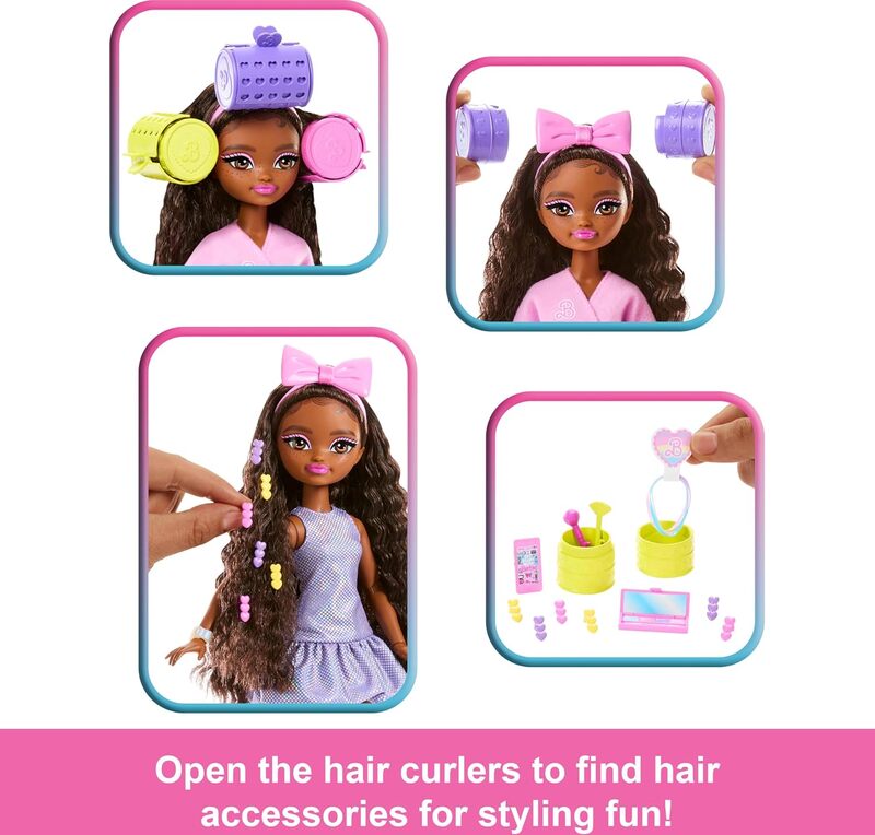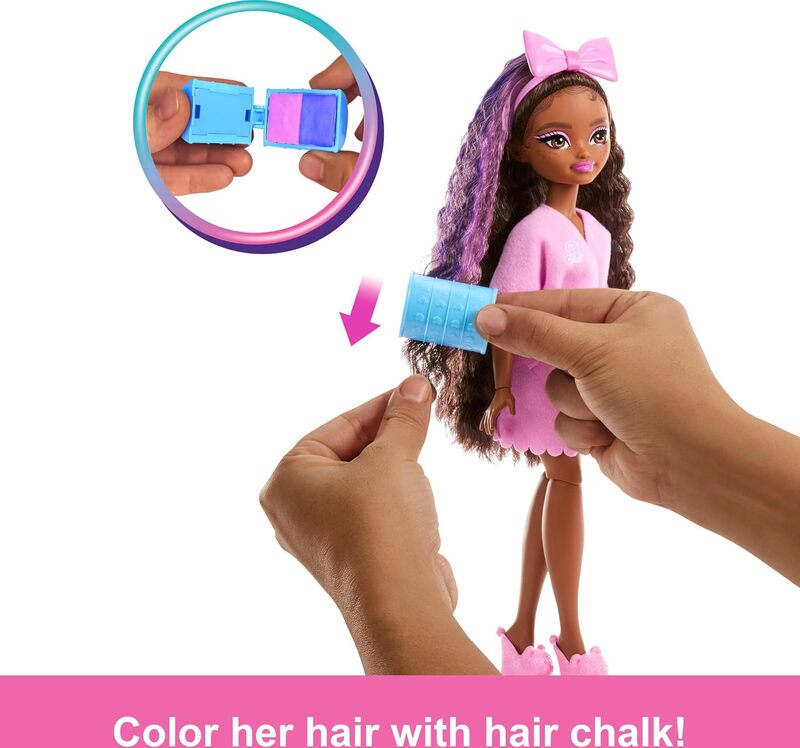 - Styling vlasov: dlhé vlasy Barbie umožňujú úpravu pomocou gumičiek, sponiek a kriedy na vlasy