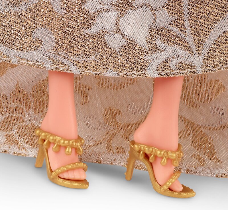 Táto verzia s blond účesom vsádza na harmóniu farieb, jemné textúry a rafinované záhyby šiat. Kontrast matu a lesku zvýrazňuje siluetu a dodáva modelu dojem haute couture. Ozdoby pôsobia elegantne, nie prezdobene, a dohromady vytvárajú nadčasovú kompozíciu, ktorá nezostarne po jedinej sezóne. Výsledkom je bábika, ktorá obstojí ako dekor aj ako zberateľské centrum vitríny.
