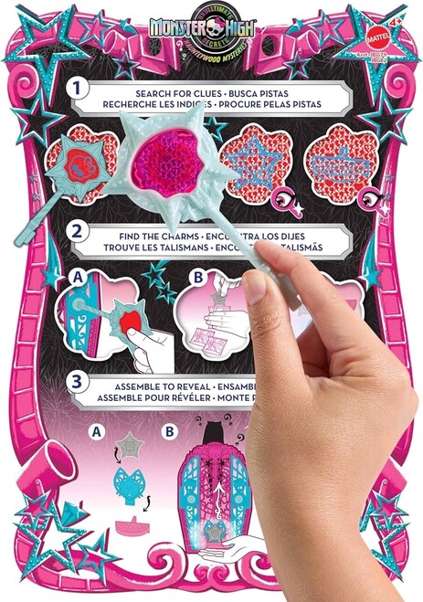 Monster High Scary Secrets Séria 6 Catty Noir Bábika Vyriešte záhadu, otvorte bránu Hollyghost a objavte bábiku Monster High v sérii Scary Secrets Hollyghost Secrets! Zahrajte sa na detektíva a nájdite stopy na mape pomocou magického kľúča lupy. A objavte viac ako 19 štýlových prekvapení, ako sú trblietavé outfity, elegantné dlhé rukavice a šperky. Po hraní môžete bábiku, oblečenie a doplnky pre bábiku schovať do skrine, čo je skvelé ako súčasť hry a skladovania. Hračka je určená pre deti od 4 rokov. Bábiky sa predávajú samostatne, v závislosti od dostupnosti. Bábika umiestnená v rôznych pózach. Bábika nestojí sama. Farby a dekoratívne prvky sa môžu líšiť.