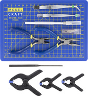 Modelcraft náradie s rezacou podložkou (sada 15ks) je 15-dielna sada náradia pre remeselníkov, modelárov a domácich majstrov. Obsahuje rezaciu podložku A5, nôž č.5 s náradnými listami, 5ks svorky 50mm, 1ks svorky 75mm, plochý pilník, kliešte štiepacie a ploché úzke, pinzeta zahnutá a plochá.