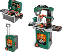Náradie stolík kufrík set. Veľkosť 38cm. Kufrík je na kolieskach a má vysúvacie madlo. Výška s vysunutým madlom 55,5 cm, výška so zasunutým madlom 38cm.
