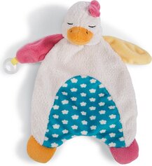Mäkká plyšová húska Gilli je nepostrádateľným spoločníkom do prvých rokov života. Super nadýchaný materiál a očarujúci dizajn MyFirstNICI pozývajú na uchopenie, dotyk a maznanie.Roztomilá biela hus s ružovou mašľou na hlave a rozkošnými spiacimi očkami inšpiruje aj oranžovými, tyrkysovými a ružovými farebnými akcentmi. Vďaka upevňovaciemu krúžku možno paplón ľahko pripevniť na všetky cumlíky, či už s rúčkami alebo bez nich.