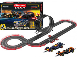Autodráha Carrera GO!!! dlhá 6,3 m s vozidlami radu GT3 Audi R8 LMS a Lamborghini Huracán obsahuje križovatku, rovinky, zákruty, klopenú zákrutu, looping, počítadlo kôl a ďalšie časti. Môžete si postaviť ďalšie rôzne trate podľa svojej fantázie.
