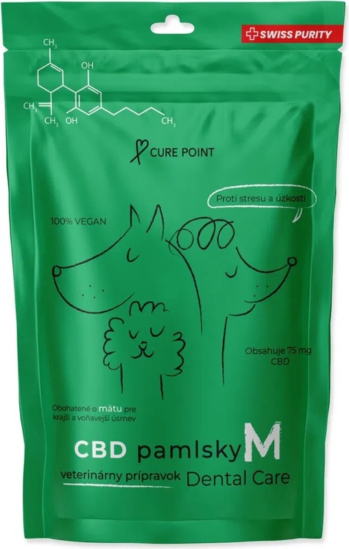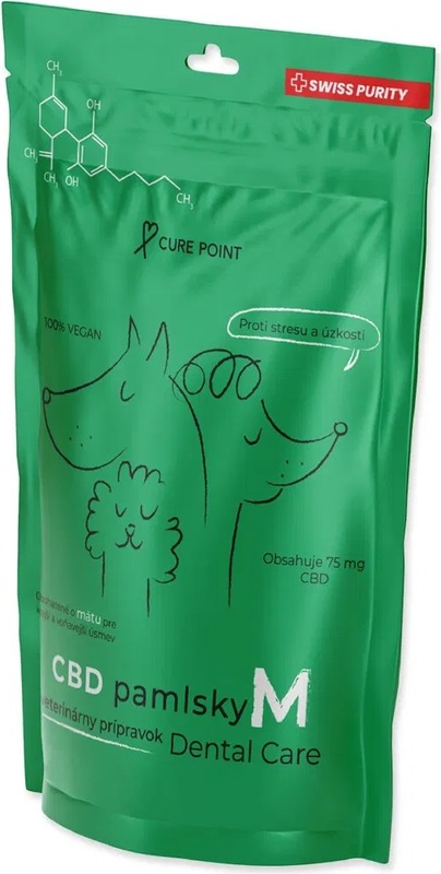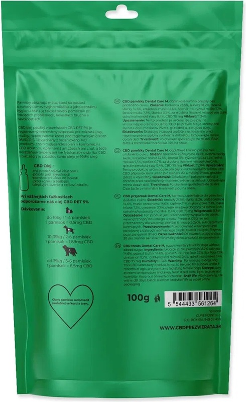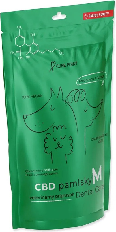 Veterinárny prípravok pre psy od 10kg do 35kg s obsahom účinnej látky CBD (Canabidiol). Prípravok je obohatený o mätu, ktorá má antiseptický účinok a osviežuje dych psa. Mäta tiež napomáha pri tráviacich ťažkostiach, bolestiach brucha a nevoľnosti.