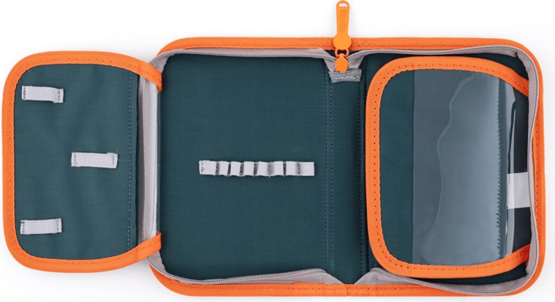 Jednoposchodový školský peračník s 2 chlopňami, prázdny obsahuje 25 gumových pútok na uchytenie písacích potrieb.