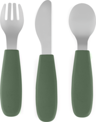 Sada obsahuje lyžičku, vidličku a nôž, ktoré pomáhajú dieťaťu naučiť sa jesť samostatne – deň čo deň, jedlo za jedlom. Funkčné časti sú vyrobené z kvalitnej nehrdzavejúcej ocele, rukoväte sú ergonomické a potiahnuté mäkkým silikónom vhodným na kontakt s potravinami – ideálne prispôsobené detským rúčkam. To zaručuje pohodlný a istý úchop a podporuje správne stravovacie návyky. Zaoblené hrany zvyšujú bezpečnosť a moderný dizajn krásne ladí s ostatným detským riadom.