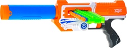 - Pištoľ so zabudovaným posuvným zásobníkom na 10 mäkčených penových nábojov a 2 terče