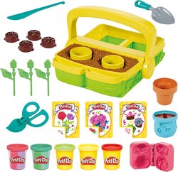 Sada obsahuje: záhradný box, 4 kvetinové kotúče, 3 stonky, formu na kvety, vázu, kvetináč, lopatku, nožnice, nôž, 5 téglikov Play-Doh a 3 kartičky s návodmi na použitie.