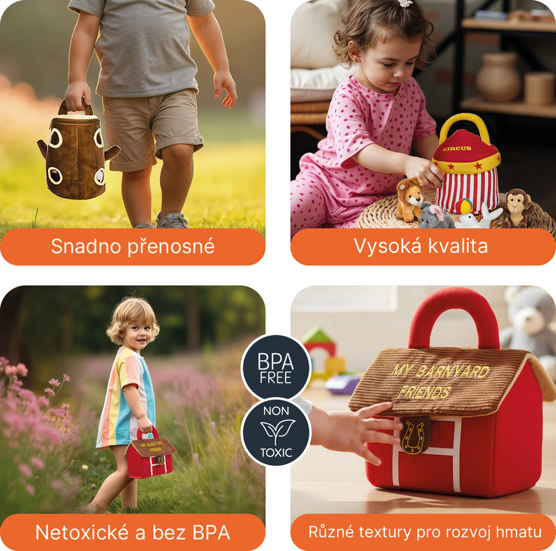 Objavte svet zábavy a učenia s touto plyšovou sadou pre deti. Každý tematický domček ukrýva štyroch milých zvieracích kamarátov a slúži ako hrací kufrík aj rozvojová hračka, ktorá podporuje predstavivosť a jemnú motoriku.