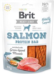 Sušené mäsové maškrty pre dospelé psy všetkých plemien Brit Jerky Protein Bar vo forme proteínovej tyčinky. S obsahom 85 % mäsa z lososa a kuraťa.