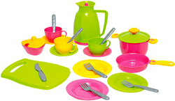 Sada riadu obsahuje kanvicu, hrniec, panvicu, taniere, príbory, krájajúcu dosku, cukorničku, šálky a podšálky.