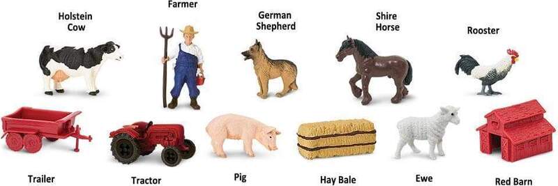 Kravy holštýnskej (Holstein cow), Farmára, Nemeckého ovčiaka (German shepherd), Kôň Shire (Shire horse), Kohúta, Prívesu (trailer), Traktora, Prasaťa, Balíka sena (hay bale), Ovce (ewe) a Červenej stodoly (red barn).