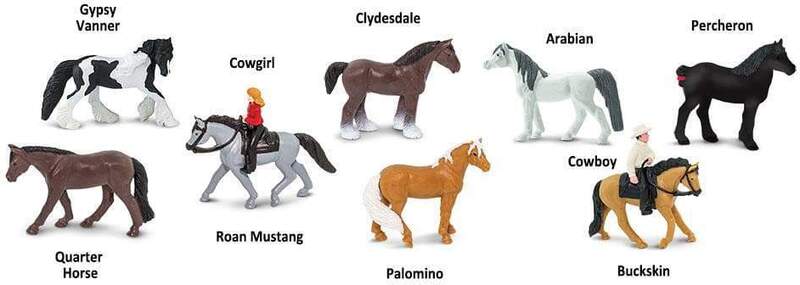Gypsy Vanner, Clydesdale, Arabského koňa, Percherona, Quarter Horse a Palomino koňa, ako aj Mustanga s kovbojkou a Buckskin koňa s kovbojom.