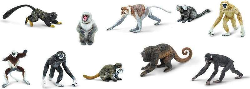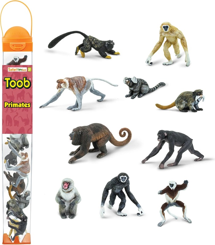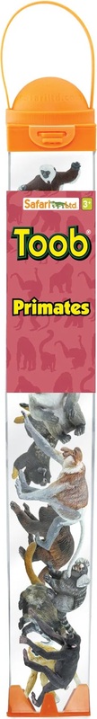 Primáty v tomto TOOB sa rozprestierajú od lemurov po opice a ľudoopy. Balenie obsahuje desať figúrok: Indri (konkrétne Sifaka Coquerelova), Makak japonský, Vrešťan, Kosmáč bielofúzy (Common Marmoset), Tamarin čierno-červený (Red-handed Tamarin), Tamarin cisársky (Emperor Tamarin), Kahau nosatý (Proboscis Monkey), Bonobo a dva Gibony. Indriidae je lemur, zatiaľ čo Bonobo a Gibony sú ľudoopy. Zvyšok sú opice. Tieto miniatúrne figúrky sú dynamicky pózované a majú vedecky presné, vysoko detailné tvarovanie, ktoré z nich robí skvelé Montessori hračky pre lekcie o prírodnom svete.