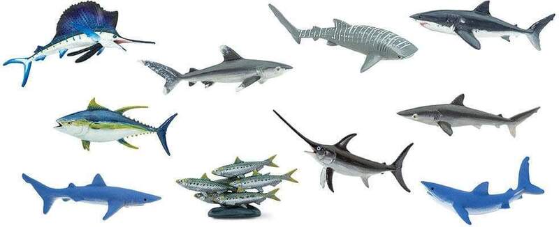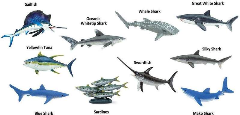 Tieto figúrky pelagiálnych rýb sú plné vedecky presných detailov! Táto súprava obsahuje širokú škálu pelagiálnych rýb, vrátane: Plachetníka tichomorského (Sailfish), Mečiara (Swordfish), Tuniaka žltoplutvého (Yellowfin Tuna), Žraloka hodvábneho (Silky Shark), Žraloka beloškvrnného (Oceanic Whitetip Shark), Žraloka bieleho (Great White Shark), Žraloka modrého (Blue Shark), Žraloka mako (Mako Shark), Žraloka obrovského (Whale Shark) a skupiny Sardiniek (Sardines).