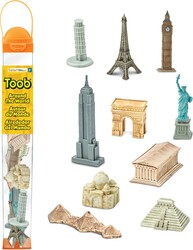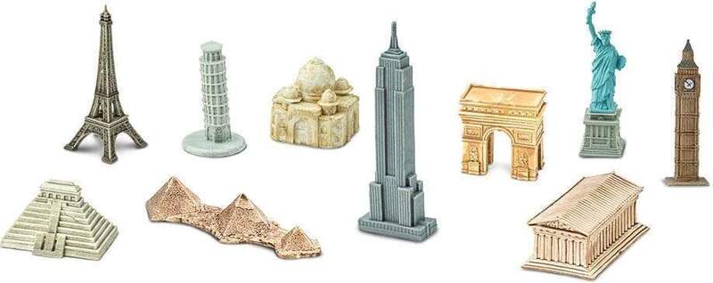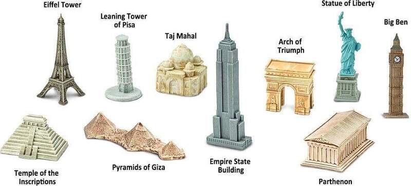 Šikmej veže v Pise (Leaning Tower of Pisa), Eiffelovej veže (Eiffel Tower), Tádž Mahalu (Taj Mahal), Víťazného oblúka (Arch of Triumph), Sochy Slobody (Statue of Liberty), Chrámu nápisov (Temple of Inscriptions), Pyramíd v Gíze (Pyramids of Giza), Empire State Building (Empire State Building), Big Ben (Big Ben) a Parthenónu (Parthenon).