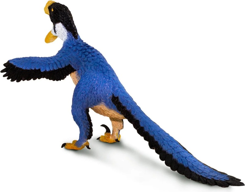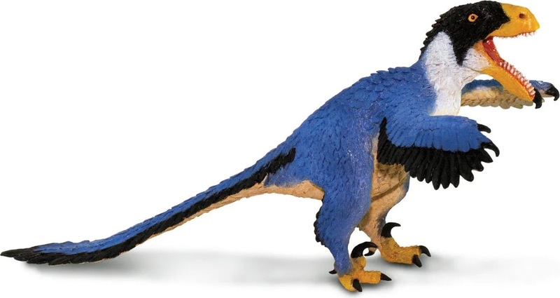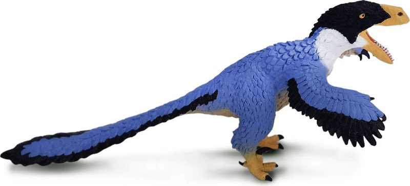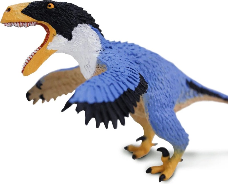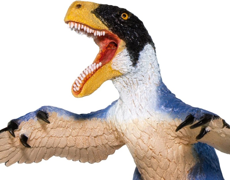 Tento Utahraptor je pripravený skočiť! S doširoka otvorenými ústami a roztiahnutými operenými ramenami, mali by sa mať ostatné dinosaury na pozore! Jeho operené telo má modré sfarbenie na chrbte a svetlohnedé na spodnej časti, s čiernobielymi značkami na hlave.