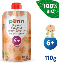 - Bio tekvica (43%), bio bataty (32%), bio pyré z manga (25%). Bez lepku.
