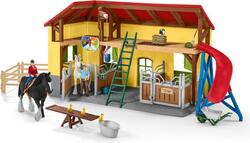 Nové farebné konské stajne Schleich® ponúkajú mnoho skvelých hracích funkcií a deti si s nimi budú hrať rady a dlho ! Pretože s 7 roztomilými zvieratami, 2 konskými boxmi, farmárom Paulom a farmárkou Laurou a samozrejme s množstvom doplnkov si môžu krásne hrať na každodennú prácu v stajniach. Kým farmárka pripravuje kone na vychádzku, farmár Paul prepravuje pomocou kladkostroja nové kŕmenie do senníku. Pomocou dopravných valčekov je pre neho úplne jednoduché dopraviť balík sena ku šmykľavke na kŕmenie, aby tadiaľ razantne zišiel do fúrika. Prostredníctvom ukazovateľa kŕmenia možno postupne nastavovať, čo majú zvieratá dostať k jedlu. Všimol si farmár roztomilé myšky, čo sedia v myšacej diere? Konskú stajňa si deti pomocou nálepiek môžu ľubovoľne upraviť podľa svojho.