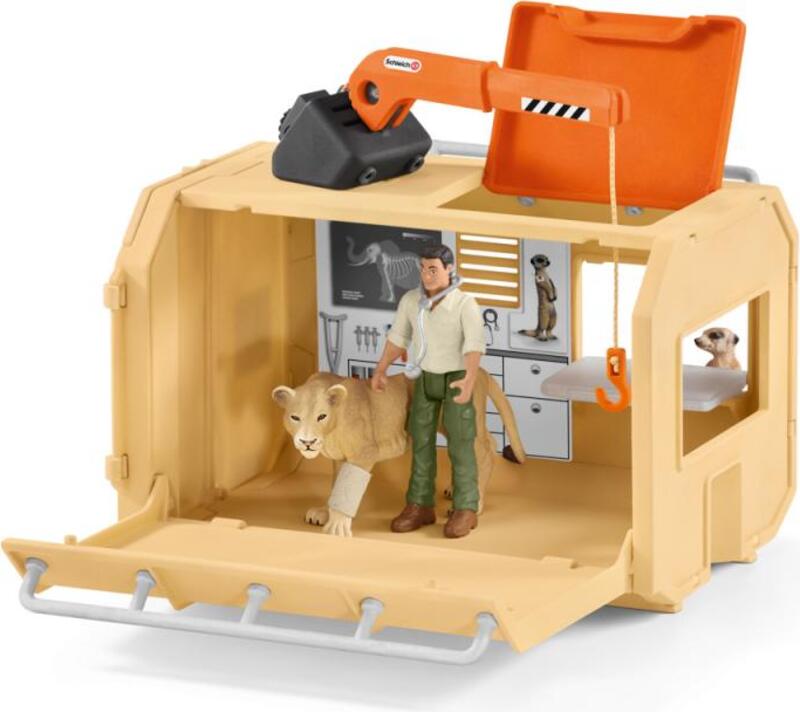 Správca parku Tom a jeho kamarát PERMONÍK Ted idú spoločne vo veľkom záchrannom voze pre zvieratá Schleich®Wild Life na svoju prvú spoločnú misiu. Na Safari nájdu Tom a Ted levicu, ktorá musí byť urgentne ošetrená. Tom a Ted teda spustia ošetrovacie kabínu auta na zem. Teraz možno začať s ošetrením, pretože auto je na to perfektne vybavené. Obväzy a stetoskop má ranger Tom stále pri ruke.