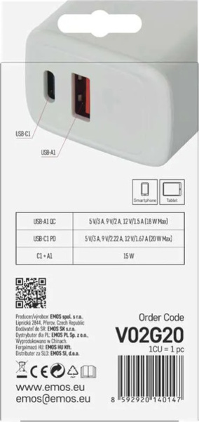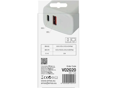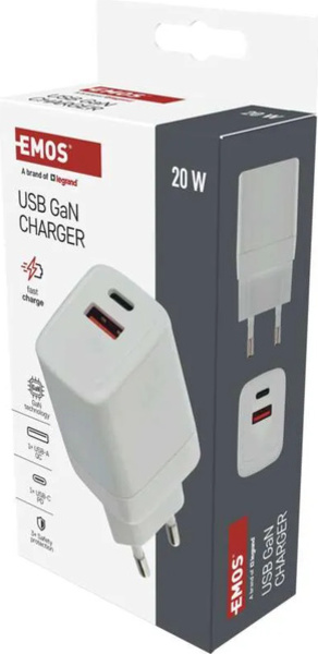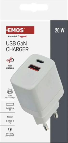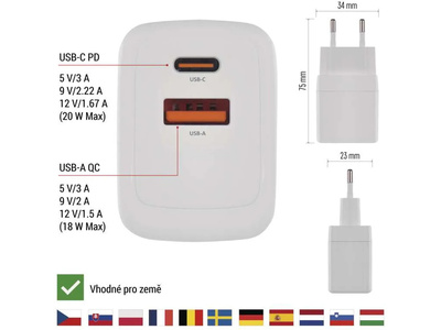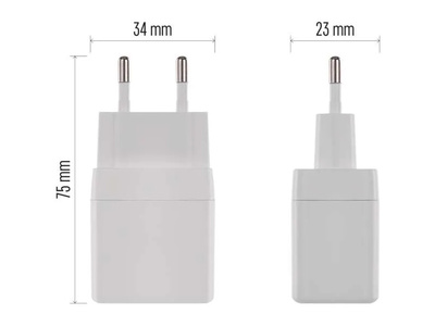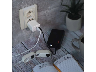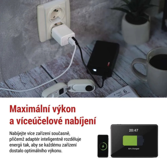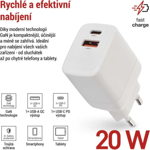 Výkonný univerzálny sieťový adaptér USB s výkonom až 20W a dvoma výstupmi - 1x USB-A (klasický), 1x USB-C. Adaptér zabezpečí rýchle a spoľahlivé nabíjanie a napájanie telefónov, tabletov, notebookov, USB nabíjačiek a ďalších zariadení. Tranzistory s Nitridom Gália poskytujú vysokú účinnosť pri zachovaní kompaktných rozmerov. Automatické a efektívne rozdelenie výkonu na jednotlivé výstupy podľa požiadaviek pripojených zariadení.