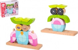 Skladačka sova obsahuje 19 drevených dielikov , ktoré je možné rôzne stavať na podložku s tyčkami.