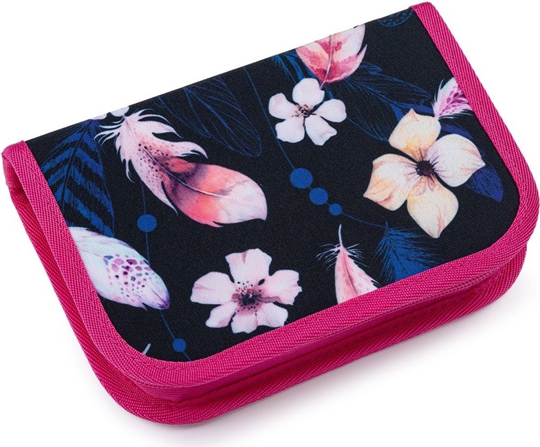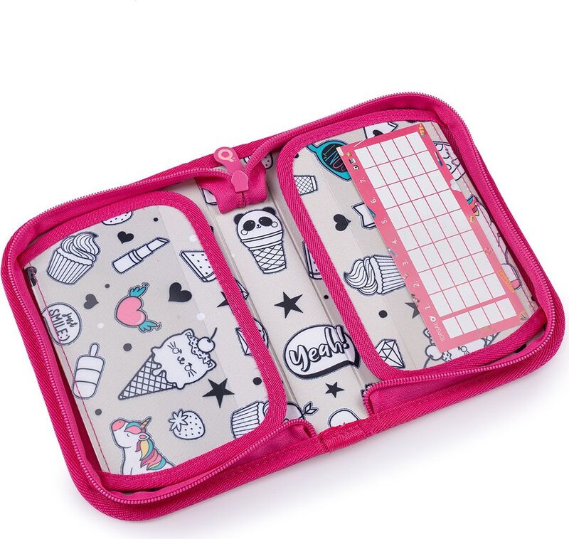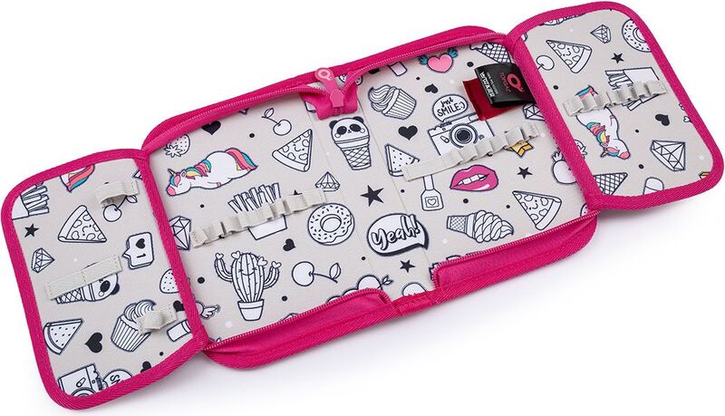 Jednoposchodové školské puzdro s dvoma poklopami je vybavené 21 klasickými gumovými úchytmi na pastelky a fixkami, troma širšími úchytmi na pravítko, kružítko či nožnice a dvoma väčšími úchytmi na gumu a strúhadlo. Pod chlopňou z priehľadnej fólie nájdete rozvrh hodín, druhé poslúži napríklad aj na ťaháky :-)