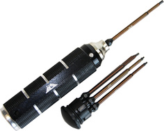 Skrutkovač s výmennými bitmi. Dĺžka bitov 75 mm, rúčka je opatrená magnetom proti samovoľnému uvoľneniu bitu. Dĺžka drieku 64 mm, dĺžka rukoväte 111 mm a priemer 26 mm.