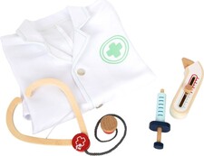 Kompletný hrací set s lekárskym plášťom a zdravotníckym vybavením. Nájdete tu injekčnú striekačku, stetoskop a teplomer z robustného dreva. Piest striekačky sa po stlačení zatiahne.
