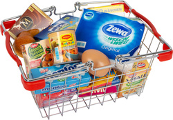 Taká záplava tovaru, až oči prechádzajú! Malý nákupný košík je až po okraj naplnený rozmanitými plastovými maketami známych výrobkov každodennej potreby.