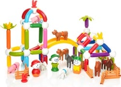 Sada obsahuje 9 magnetických zvieratiek, 3 farmárov a stavebné diely, z ktorých si postavíte zakaždým novú farmu.