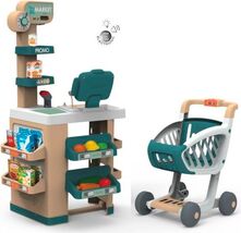 Supermarket s elektronickou pokladňou vr. integrované funkcie výpočtu, skenerom so zvukom a svetlom a ďalším príslušenstvom.Súčasťou je aj nákupný vozík. Rozmery: 48,9 x 38,5 x 89,6 cm.