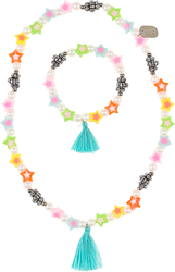 Krásna sada pre malé parádnice od 3 rokov obsahuje korálkový náhrdelník a ladiaci elastický náramok. Oba šperky zdobia modrý strapec. Kombinácia korálok v tvare hviezdy a perličiek dodáva šperkom jemný a hravý vzhľad, ktorý si deti zamilujú. Ideálny doplnok na oslavy, fotenie aj pre každodennú radosť.