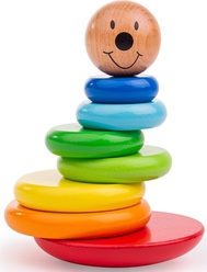 Každý z farebných kruhov má vo vnútri magnet a tak pevne drží pospolu. Deti musia kruhy nasadiť v správnom poradí, aby im vznikla pyramída, na ktorú môžu nakoniec nasadiť drevenú guľu s tvárou.