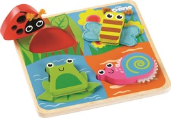 To sú len 2 zo štruktúr, ktoré môžu deti s touto hračkou objaviť. Zvieratá, ktoré sú ilustrované v prostredí prírody – lienka, včela, žaba a slimák. Senzorické puzzle je ideálnou hračkou pre skorý rozvoj dieťaťa. Vyberte dieliky puzzle a objavte 4 rozdielne štruktúry, ktoré sa pod nimi skrývajú. Mladí umelci môžu dieliky použiť na obkresľovanie.