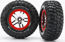 Kompletné zadné kolesá pre 2WD, predné aj zadné pre 4WD RC autá Traxxas. Strieborný disk Split Spoke s červenými ráfikmi s pneumatikami BFGoodrich KM2 Mud Terrain (S1 super mäkká zmes) s vložkou.