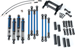 Tuningová konverzná sada v modrej farbe pre podvozok Traxxas TRX-4 umožňujúci vyšší zdvih kolies. Súprava obsahuje všetky potrebné diely potrebné na prestavbu.