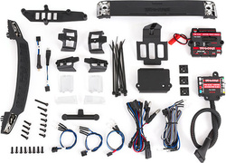 Balenie obsahuje Pro Scale napájací riadiaci modul LED, rozvodný modul LED, držiak modulu, káble senzora motora, propojovací kábel s prijímačom, propojovací Maxx kábel s prijímačom TQi, montážne príslušenstvo, komponenty LED osvetlenia z inštalačnej sady a LED svetelné sady. Návod CZ a manuál EN, DE, FR, SP.